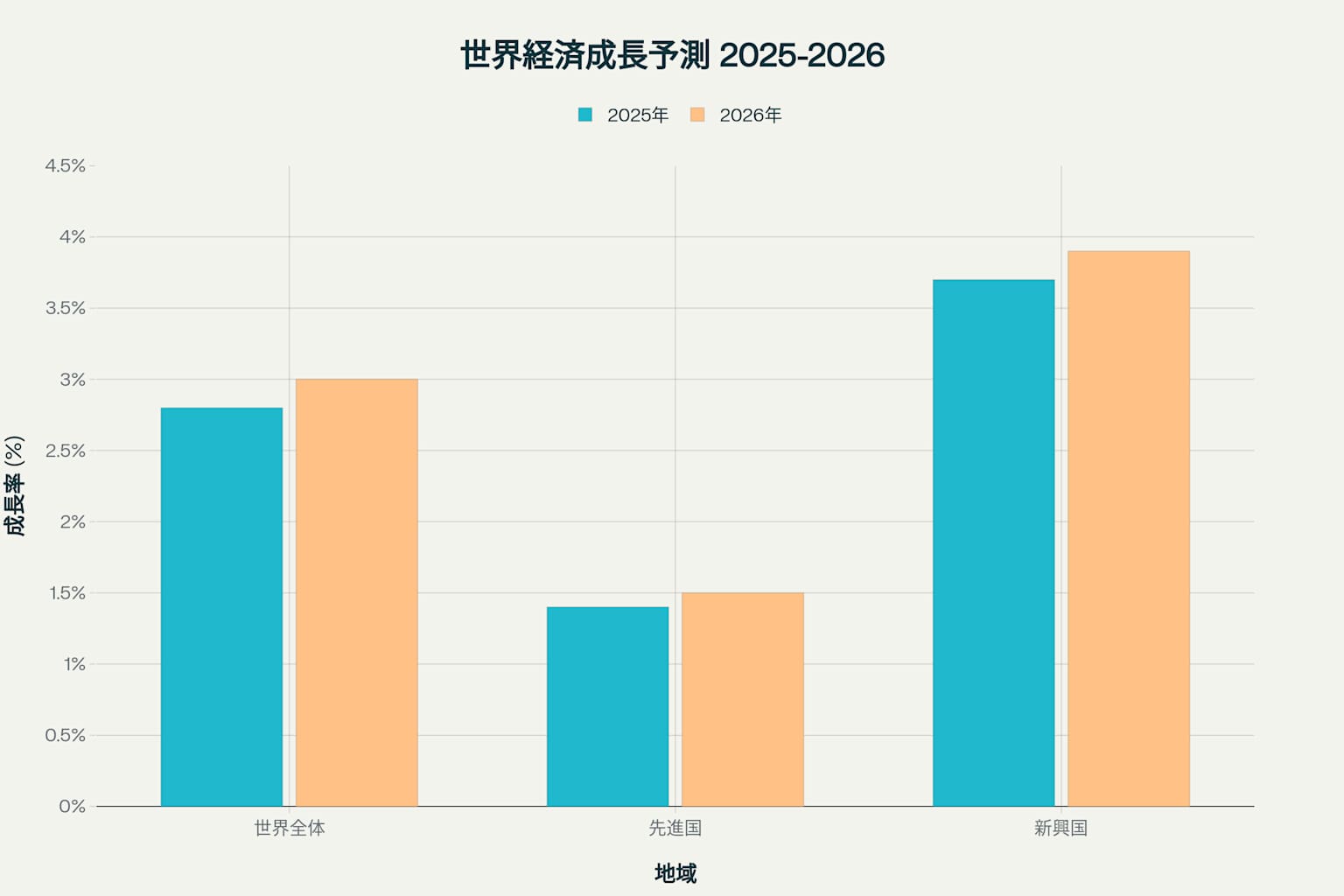 2025년 글로벌 경제 전망은 미중 무역갈등 심화와 정책 불확실성 증가로 인해 성장률 둔화가 예상된다. IMF에 따르면 세계 경제 성장률은 2025년 2.8%에서 2026년 3.0%로 완만한 회복세를 보일 것으로 전망되며, 선진국은 2025년 1.4%에서 2026년 1.5%로, 신흥국은 2025년 3.7%에서 2026년 3.9%로 각각 성장할 것으로 예상된다.