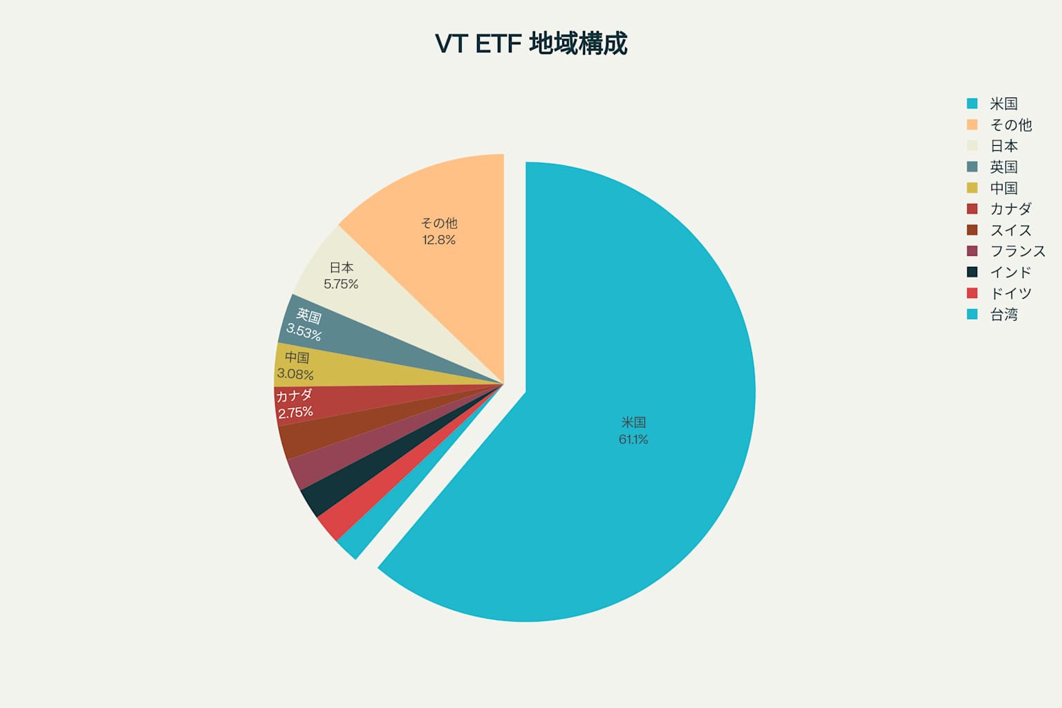 SBI・V・全世界株式는 バンガード・トータル・ワールド・ストックETF(VT)를 투자 대상으로 하여 전세계 47개국 약 9,000종목에 분산투자한다. VT ETF의 지역별 투자 비중을 살펴보면, 미국이 61.15%로 압도적인 비중을 차지하고 있다. 이어 일본 5.75%, 영국 3.53%, 중국 3.08%, 캐나다 2.75% 순으로 구성되어 있어, 사실상 미국 주식시장의 영향을 크게 받는 구조이다.