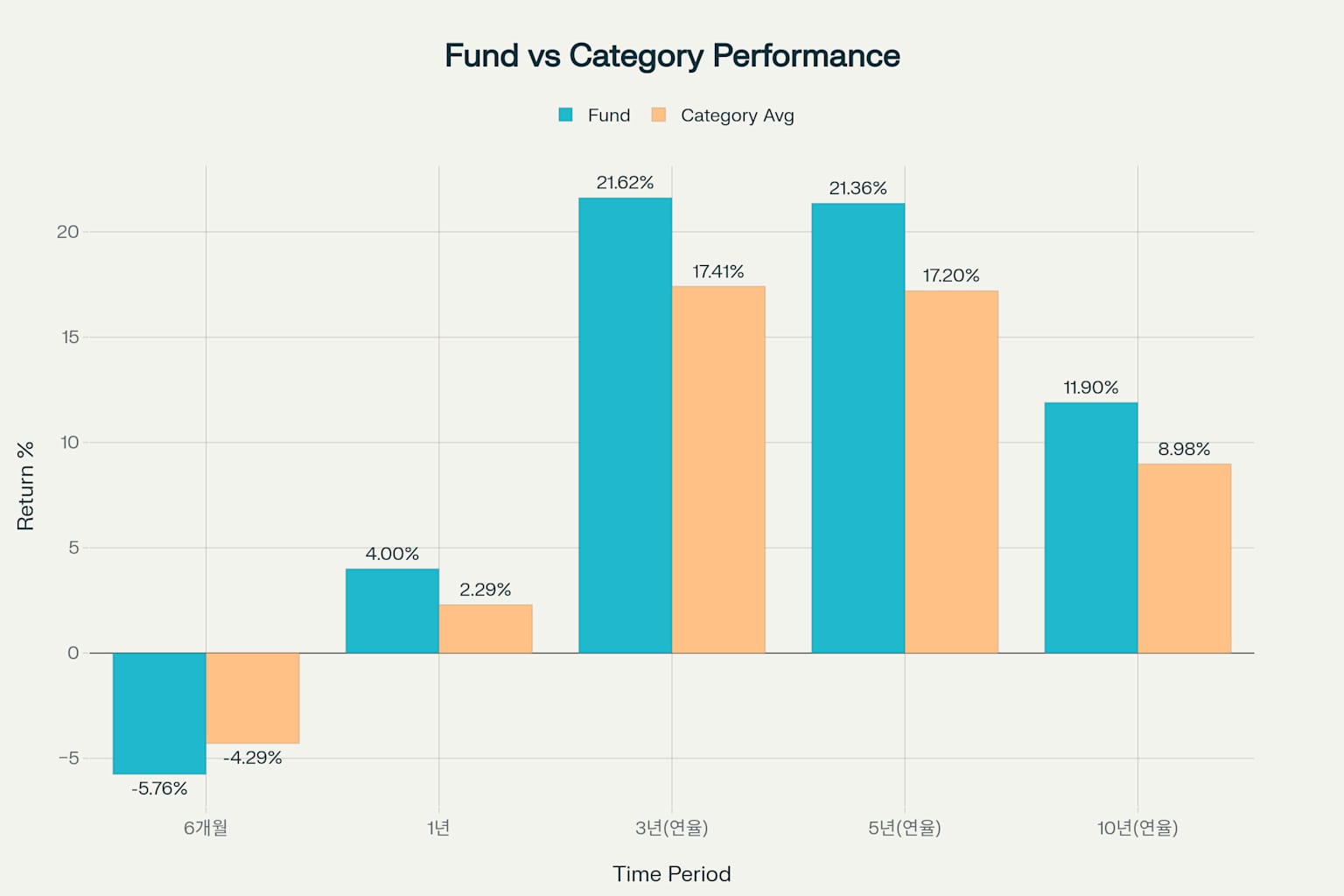 이 펀드의 진가는 장기 성과에서 드러난다. 10년 연율화 수익률 11.90%는 동일 분류 평균 8.98%를 무려 292bp나 상회하는 압도적인 수치다. 5년 연율화 수익률 21.36% 역시 분류 평균 17.20%를 416bp 웃돌며, 3년 수익률도 21.62%로 분류 평균 17.41%를 크게 앞선다.