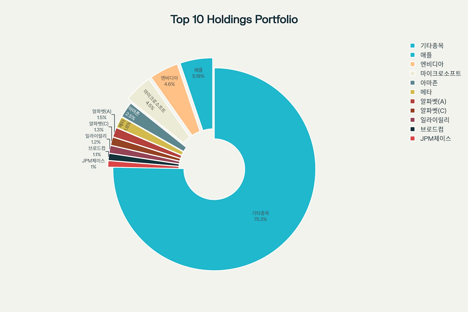 포트폴리오 상위 10대 종목을 살펴보면 모두 미국 기업으로, 총 편입비중이 24.69%에 달한다. Apple 5.19%, NVIDIA 4.60%, Microsoft 4.50% 순으로 구성되어 있어 미국 빅테크 기업들의 글로벌 시장 지배력을 그대로 반영하고 있다.